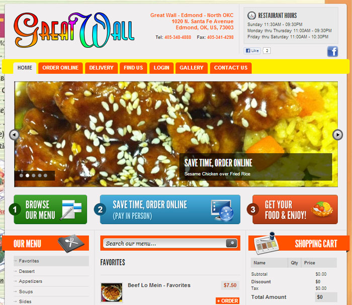 Below is a screenshot of an actual client site for an Asian restaurant with built in online ordering system. This could be your website. Fully customizable to support your specific type of restaurant and food.