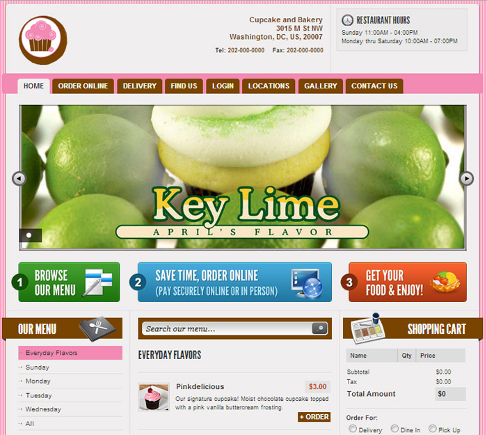 Below is a screenshot of a demo bakery / cupcake store site with built in online ordering system. This could be your website. Fully customizable to support your specific type of restaurant and food.