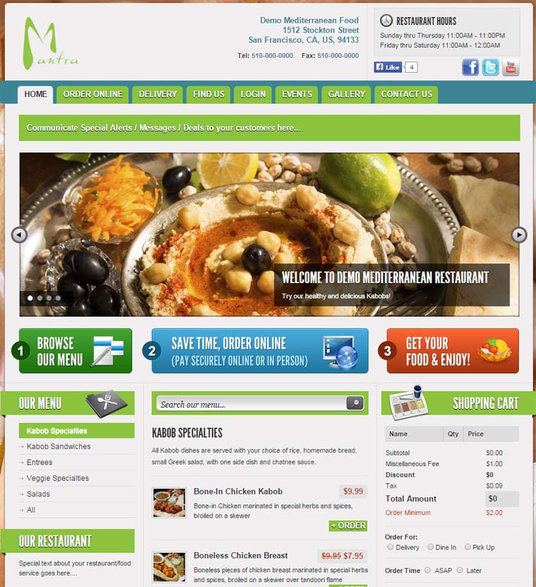Below is a screenshot of a demo website for a Mediterranean restaurant with built in online ordering system. This could be your website. Fully customizable to support your specific type of restaurant and food.